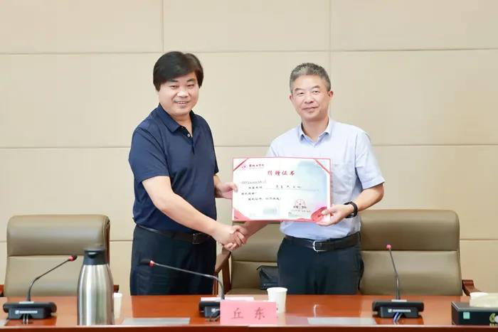 捐贈(zèng)儀式上,后勤服務(wù)集團(tuán)負(fù)責(zé)人代表學(xué)校接受江蘇乾寶生物科技有限公司的捐贈(zèng),宋長(zhǎng)春向江蘇乾寶生物科技有限公司發(fā)放捐贈(zèng)證書(shū)。
