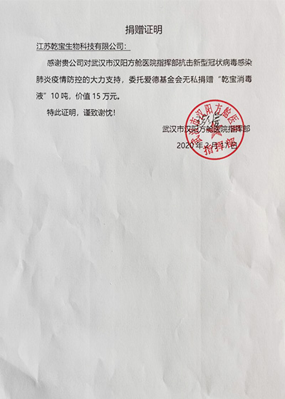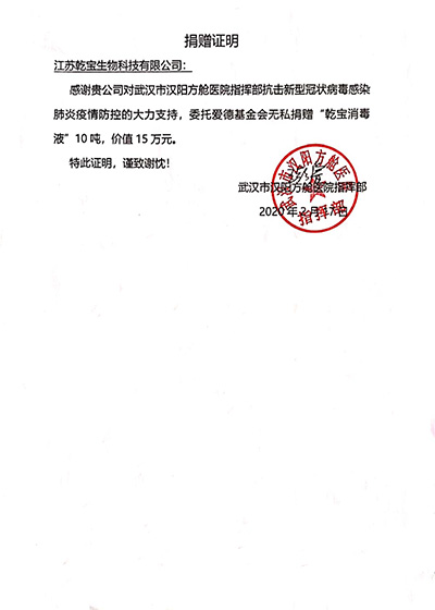 • 武漢漢陽方艙醫院捐贈證書