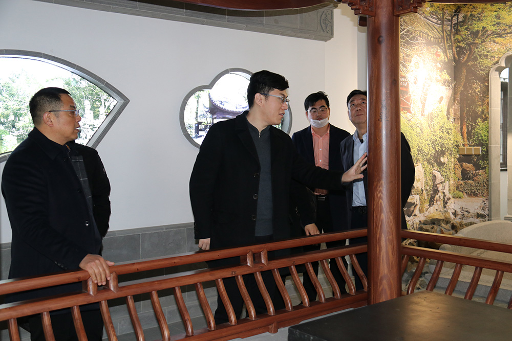 集團領導陪同李旭總監一行參觀了太湖書院一園五館,并重點考察了非遺古建館內的蘇式建筑相關器具展品、琴棋書畫館內的戲臺建造樣式,以及書院精心打造的下沉式蘇式園林——易園,全面了解了乾寶集團旗下建筑設計公司在蘇式園林和中式建筑設計營造方面的專業和特色。