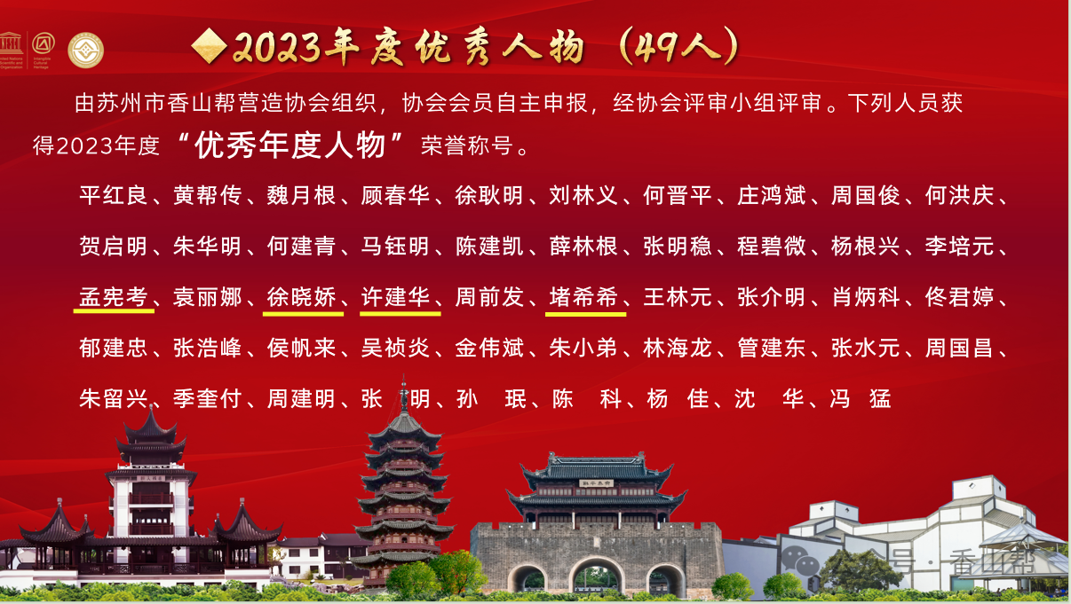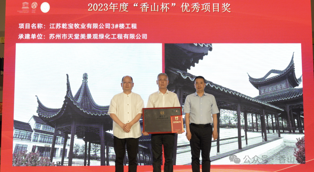 2024年6月17日下午,蘇州市香山幫營造協會會員代表大會在香山工坊禮堂召開。會前,蘇州市香山幫營造協會組織協會會員自主申報,并組織專家評審了2023年度香山幫營造技藝“優秀傳承企業獎”和“優秀人物獎”。會上對30家單位和49位個人頒發了獲獎榮譽證書,其中江蘇乾寶集團旗下的蘇州市天堂美景觀綠化工程有限公司獲得了“2023年度優秀傳承企業獎”,4名員工榮獲“2023優秀年度人物”稱號。