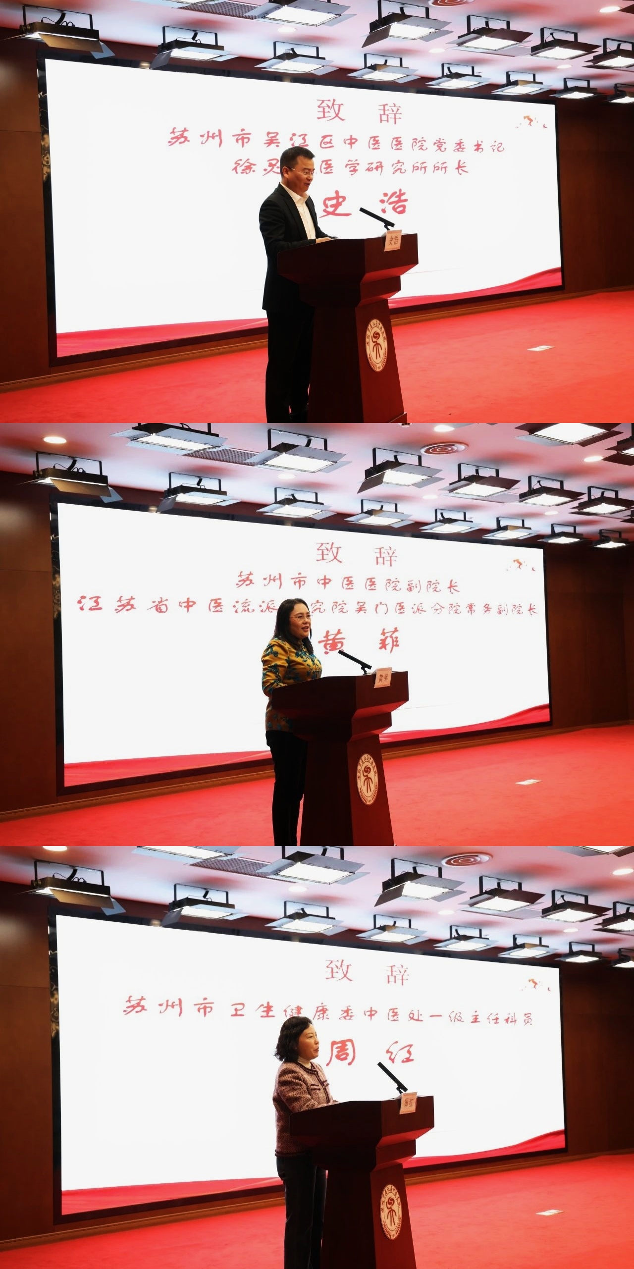 活動(dòng)開幕式上,吳江區(qū)中醫(yī)醫(yī)院書記、徐靈胎研究所所長(zhǎng)史浩,蘇州市中醫(yī)醫(yī)院副院長(zhǎng)、江蘇省中醫(yī)流派研究院吳門醫(yī)派分院常務(wù)副院長(zhǎng)黃菲,蘇州市衛(wèi)健委中醫(yī)處一級(jí)主任科員周紅分別致辭。