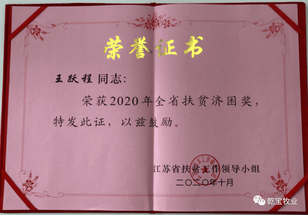 10月17日,在第七個全國扶貧日到來之際,省政府召開脫貧攻堅表彰大會,江蘇乾寶牧業有限公司董事長王躍程獲得了省扶貧濟困獎。這是對王躍程董事長多年來,牢記企業家社會責任,以產業報國,以產業惠民所作貢獻的肯定和褒獎。