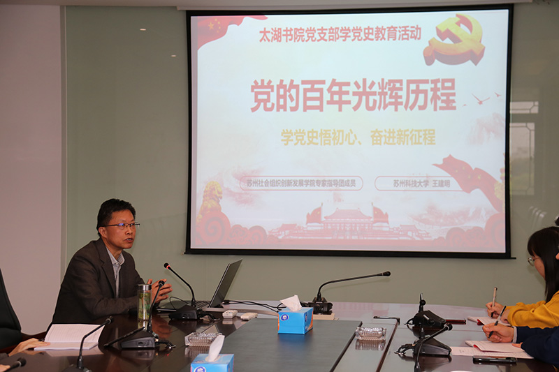 為深入學習習 近平總書記在黨史學習教育動員大會上的講話精神,認真貫徹落實中央和省委、市委、以及市社會組織黨委關于黨史學習教育活動的實施方案,4月1日上午,太湖書院黨支部開展“黨的百年輝煌——學黨史,悟初心”學黨史專題教育活動,由黨史學習教育市委宣講團成員、蘇州科技大學馬克思主義學院教授王建明同志進行宣講,原黨支部書記丘亮輝、新一屆黨支部書記劉斌,以及支部黨員和入黨積極分子踴躍參加。