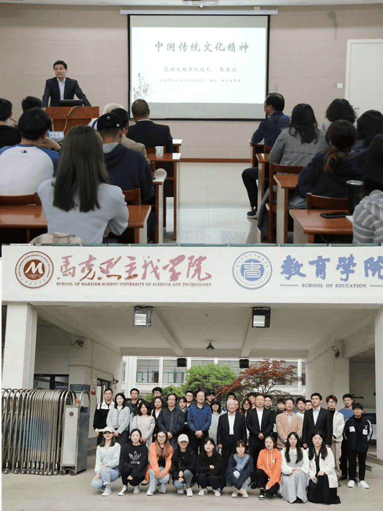 王騰教授在總結中表示,本次名家學術演講,與其說是一次學術演講,毋寧說是融合文、史、哲、藝為一體的一堂具有學術啟發意義的研究性示范教學,尤其是古今貫通、中西互鑒的方法論對碩士研究生的教育教學、學術研究乃至人才培養具有較強的指導意義。講座結束后,張其成院長欣然與蘇州科技大學馬克思主義學院哲學研究生合影留念。