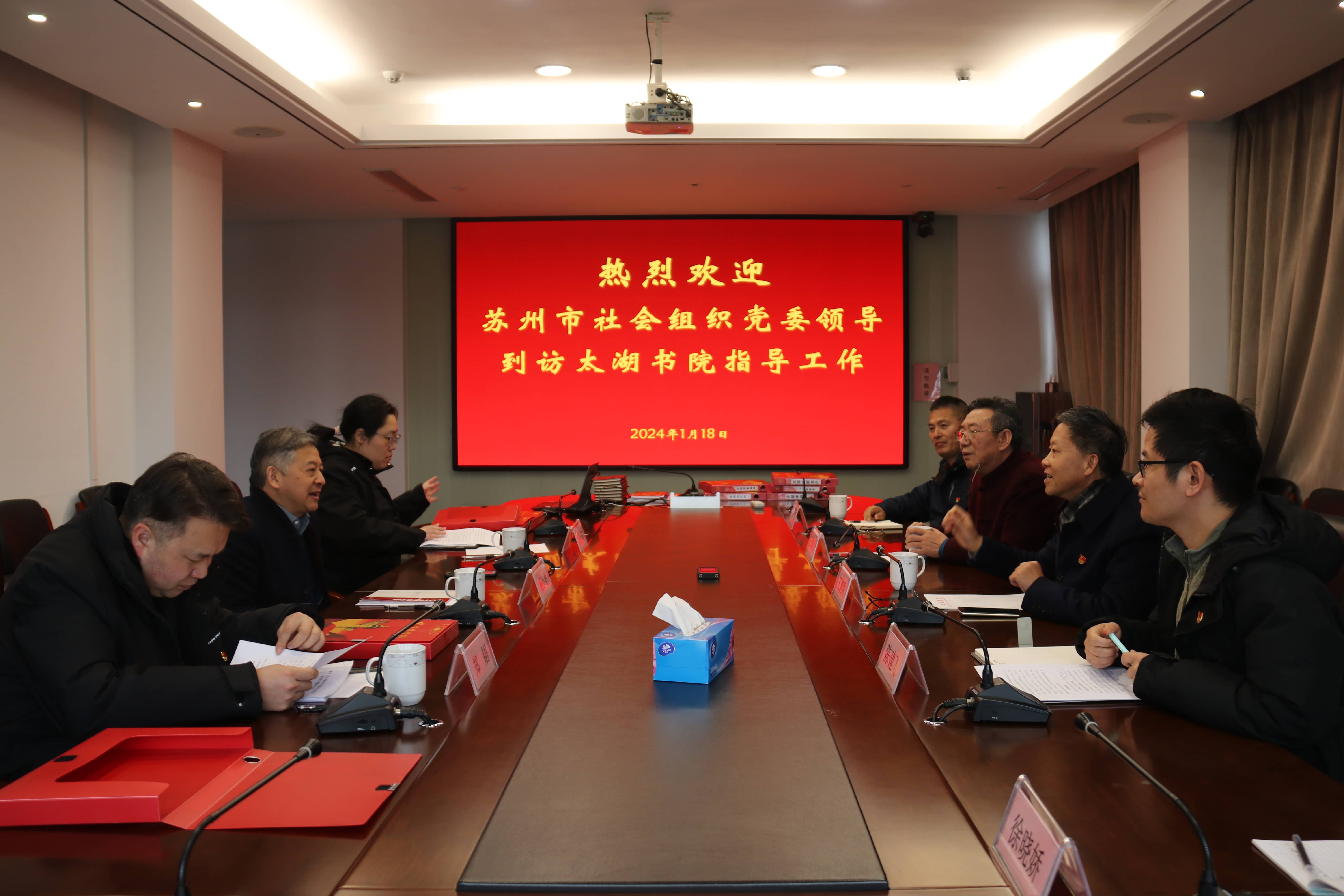 2024年1月18日下午,蘇州市社會組織黨委書記楊小勇一行到訪蘇州太湖書院指導(dǎo)支部工作并召開黨建座談會。太湖書院黨支部書記陳建飛、副書記徐曉嬌及部分黨員參加會議,江蘇乾寶集團(tuán)總裁王翼寧,太湖書院執(zhí)行院長王建明以及入黨積極分子列席會議。