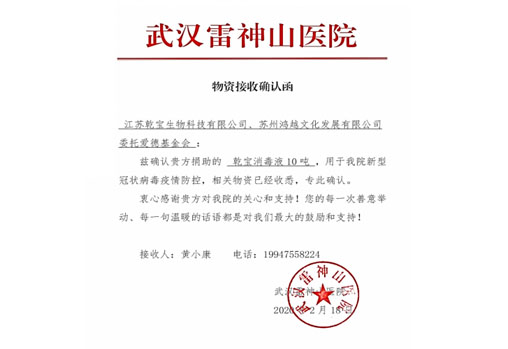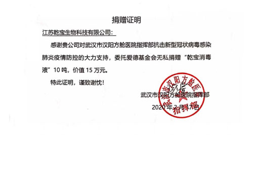 2020年1月以來,新型冠狀病毒Covid-19疫情肆虐湖北武漢并波及全國,乾寶生物科技作為一家有社會(huì)責(zé)任感的企業(yè),積極響應(yīng)黨中央和國務(wù)院號(hào)召,迅速做出反應(yīng),放棄春節(jié)假期,快速組織員工突擊生產(chǎn)防疫一線急需的消毒產(chǎn)品,于1月25日大年初一向武漢市捐贈(zèng)10噸乾寶®消毒液,并交付給湖北省人民醫(yī)院和中國人民解放軍空降兵醫(yī)院投入使用;隨后又向武漢雷神山醫(yī)院和武漢國博方艙醫(yī)院捐贈(zèng)20噸乾寶®消毒液。公司已先后向中國航天、北京市慈善義工聯(lián)合會(huì)、湖北省軍區(qū)、南京地鐵集團(tuán)、江蘇省13個(gè)地市教育系統(tǒng)、蘇州市衛(wèi)健委及下屬13家醫(yī)院、蘇州軌交集團(tuán)、鹽城市政府、四川德陽市政府、加納共和國、巴基斯坦共和國、盧旺達(dá)共和國等國家和地區(qū)捐贈(zèng)超過200噸、市場價(jià)值逾千萬的乾寶®消毒液。所捐贈(zèng)的乾寶®消毒液主要用于各地的醫(yī)院、學(xué)校、公共場所、軌道交通、農(nóng)貿(mào)市場等地方的消毒殺菌,抗擊疫情。
