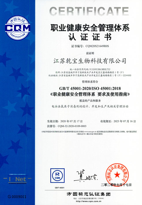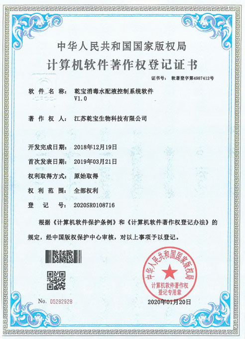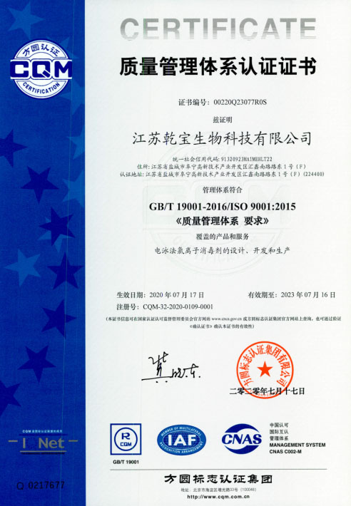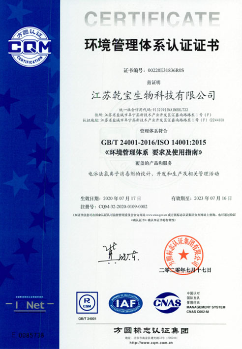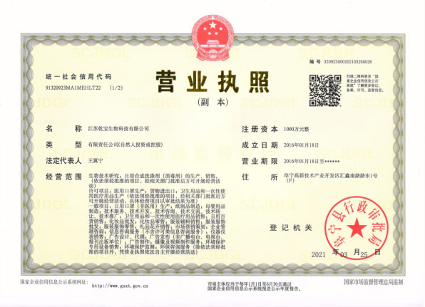 江蘇乾寶生物科技有限公司(簡稱“乾寶生物科技”)位于江蘇省阜寧高新技術(shù)產(chǎn)業(yè)園區(qū),是一家專業(yè)研發(fā)和生產(chǎn)消毒殺菌類產(chǎn)品的科技企業(yè)。公司技術(shù)力量雄厚,擁有多項(xiàng)專利,資質(zhì)齊全,已通過國家質(zhì)量管理體系(ISO 9001)、職業(yè)健康安全管理體系(ISO 45001)和環(huán)境管理體系(ISO 14001)三大體系認(rèn)證。自2016年初成立以來,公司秉持質(zhì)量可靠、用戶至上、誠信經(jīng)營的理念,立足長遠(yuǎn),銳意進(jìn)取,向廣大消費(fèi)者提供安全環(huán)保的乾寶®消毒液,保障人民的生命健康。