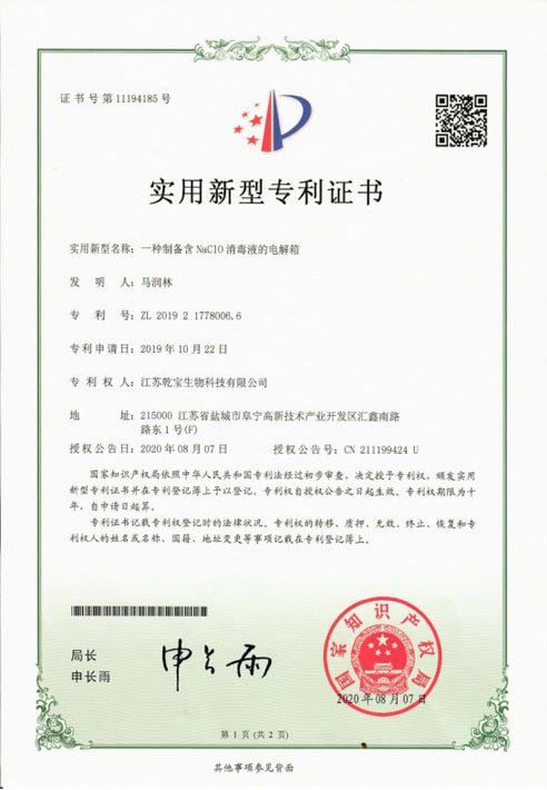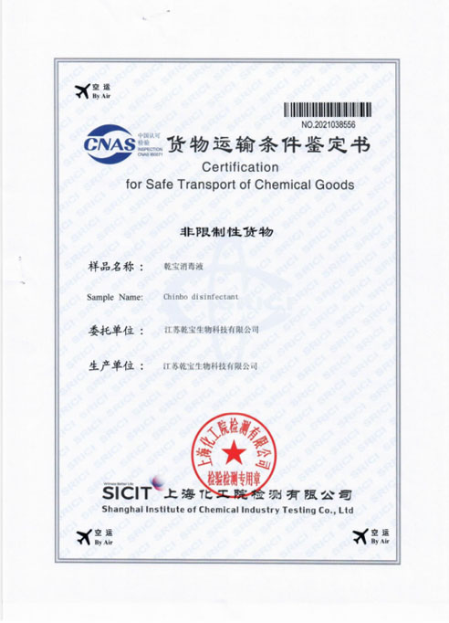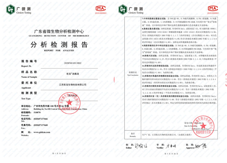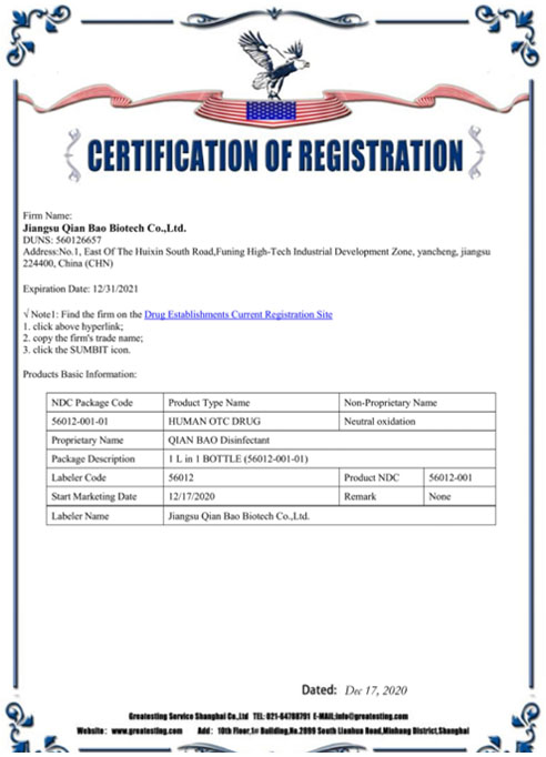 公司研發(fā)團(tuán)隊(duì)經(jīng)過多年持續(xù)研發(fā)和檢測,成功將實(shí)驗(yàn)室產(chǎn)品轉(zhuǎn)化為工業(yè)化產(chǎn)品,建成了年產(chǎn)過萬噸不燃不爆、安全環(huán)保的乾寶®消毒液,并已通過第三方的檢測,取得消毒產(chǎn)品所必須的各類資質(zhì)。乾寶®消毒液已獲得美國FDA(OTC)注冊(cè)證書和歐盟REACH認(rèn)證,擁有了打開國際市場大門的鑰匙。