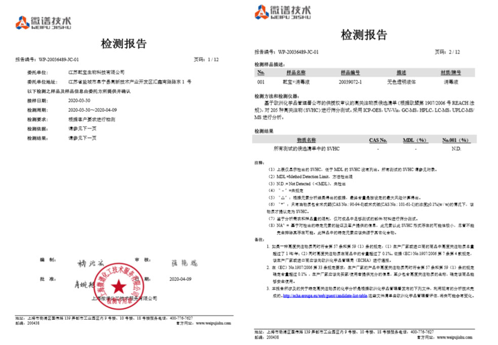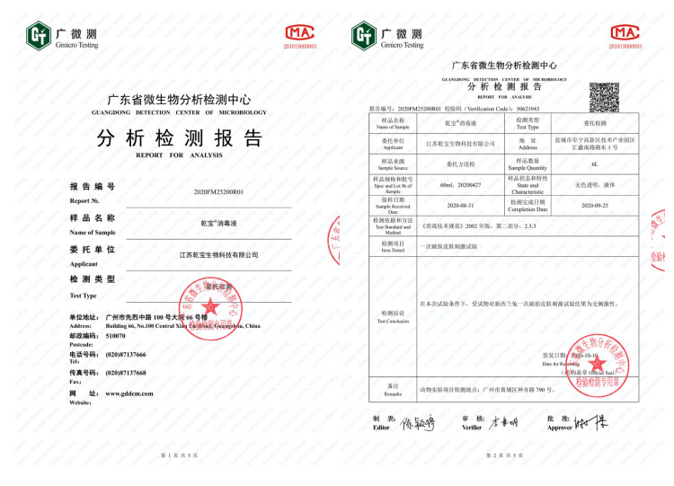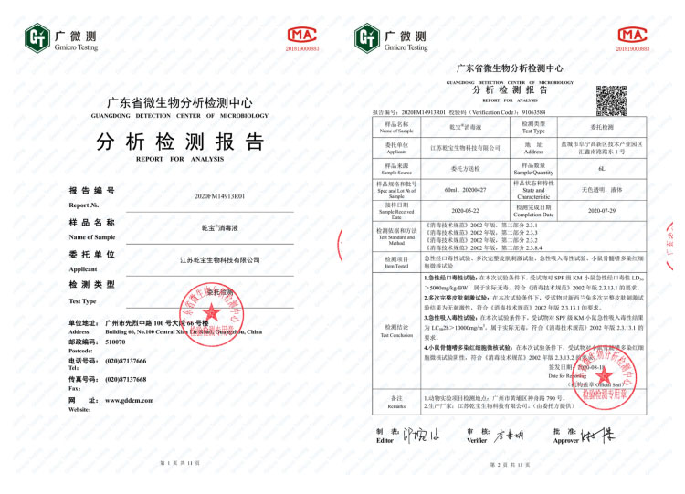 消毒效果方面,第三方權(quán)威機(jī)構(gòu)檢測結(jié)果表明,乾寶®消毒液對(duì)大腸桿菌、金黃色葡萄球菌的殺滅對(duì)數(shù)值均>5.00,對(duì)白色念珠菌的殺滅對(duì)數(shù)值均>4.00,符合《消毒技術(shù)規(guī)范》(2002年版)的要求。乾寶®消毒液的微生物污染指標(biāo)檢測結(jié)果,符合GB27951-2001《皮膚消毒劑衛(wèi)生要求》的要求。乾寶®消毒液的鉛砷汞的檢測結(jié)果,符合《化妝品安全技術(shù)規(guī)范》(2015年版)的標(biāo)準(zhǔn)要求。乾寶®消毒液對(duì)脊髓灰質(zhì)炎病毒的平均滅活對(duì)數(shù)值>4.27,符合《消毒技術(shù)規(guī)范》(2002年版)的要求。